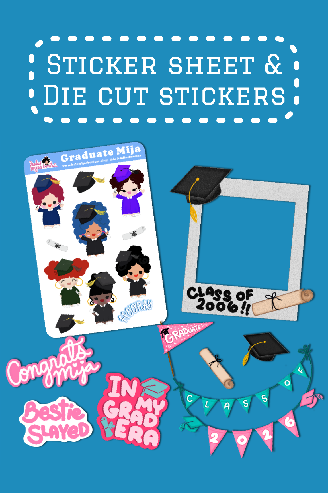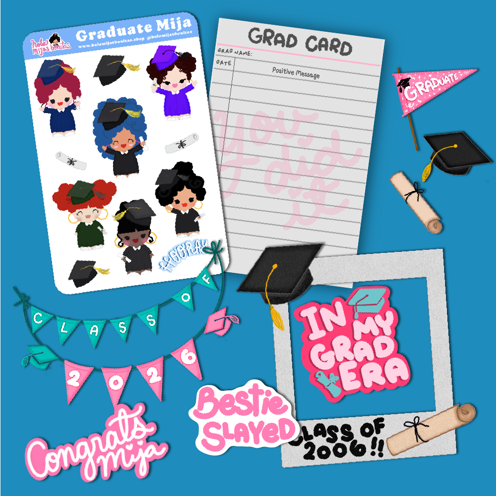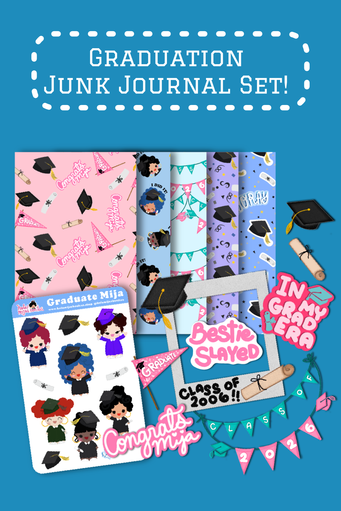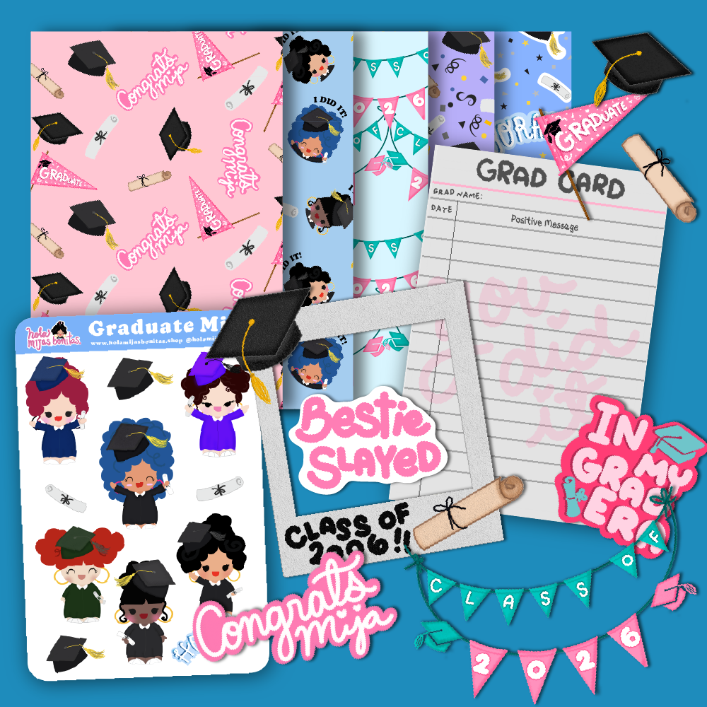 We created this cute Junk Journal Graduations Mijas Set! You get Sticker Sheet, Die Cut Stickers, and Pattern Papers! All to use on your journal! Keep this moment memorable and fun! The Mijas are so ready to celebrate this big day!
